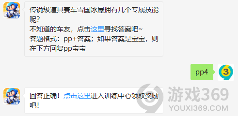 传说级道具赛车雪国冰屋拥有几个专属技能呢?答题格式:pp+答案,11月30日跑跑卡丁车每日一题的答案是什么?不知道的车主宝宝们,进来看看正确答案吧!回答正确即可领取皮蛋为大家准备的丰厚奖励了跑跑卡丁车11月30日问题:传说级道具赛车雪国冰屋拥有几个专属技能呢?