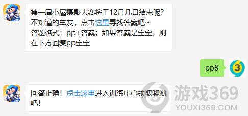第一届小屋摄影大赛将于12月几日结束呢?答题格式:pp+答案,12月1日跑跑卡丁车每日一题的答案是什么?不知道的车主宝宝们,进来看看正确答案吧!回答正确即可领取皮蛋为大家准备的丰厚奖励了跑跑卡丁车12月1日问题:第一届小屋摄影大赛将于12月几日结束呢?答案:p