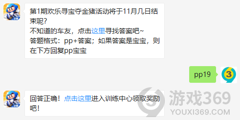 第1期欢乐寻宝夺金猪活动将于11月几日结束呢?答题格式:pp+答案,11月19日跑跑卡丁车每日一题的答案是什么?不知道的车主宝宝们,进来看看正确答案吧!回答正确即可领取皮蛋为大家准备的丰厚奖励了跑跑卡丁车11月19日问题:第1期欢乐寻宝夺金猪活动将于11月几日