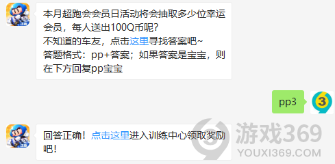 本月超跑会会员日活动将会抽取多少位幸运会员,每人送出100Q币呢?答题格式:pp+答案,11月22日跑跑卡丁车每日一题的答案是什么?不知道的车主宝宝们,进来看看正确答案吧!回答正确即可领取皮蛋为大家准备的丰厚奖励了跑跑卡丁车11月22日问题:本月超跑会会员日活