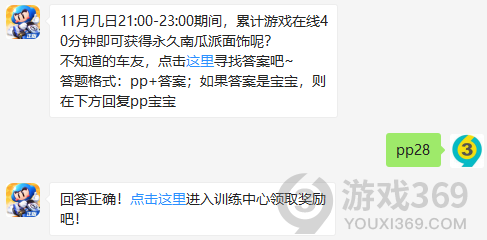 11月几日21:00-23:00期间,累计游戏在线40分钟即可获得永久南瓜派面饰呢?答题格式:pp+答案,11月23日跑跑卡丁车每日一题的答案是什么?不知道的车主宝宝们,进来看看正确答案吧!回答正确即可领取皮蛋为大家准备的丰厚奖励了跑跑卡丁车11月23日问题: