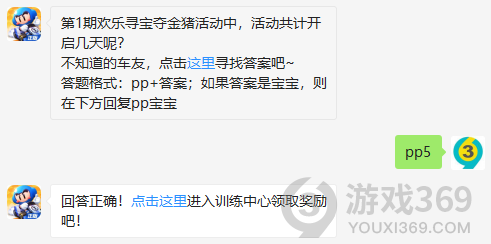 第1期欢乐寻宝夺金猪活动中,活动共计开启几天呢?答题格式:pp+答案,11月16日跑跑卡丁车每日一题的答案是什么?不知道的车主宝宝们,进来看看正确答案吧!回答正确即可领取皮蛋为大家准备的丰厚奖励了跑跑卡丁车11月16日问题:第1期欢乐寻宝夺金猪活动中,活动共计