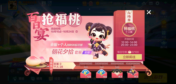 跑跑卡丁车手游百日宴抢福桃怎样达成?逐步累积个数,达到全服进度。小编带来活动内容,新时装更靓丽。百日宴抢福桃玩法奖励一览可以在每日的指定时段试玩抢福桃并尝试累计福桃数量,当个人与全服都达到阶段数据要求之时则可以获得包括时装在内的相应阶段奖励。抢福桃其实就类似之