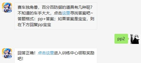 《跑跑卡丁车》赛车独角兽百分百防御的道具有几种呢?很多小伙伴们不知道跑跑卡丁车今日的题目,接下来就由小编带来跑跑卡丁车官方竞速版8月13日超跑会答题答案,快进来看一看吧。2019年跑跑卡丁车官方竞速版8月13日超跑会答题问题 赛车独角兽,百分百防御的道具有几种