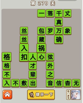 最近很多小伙伴都在问微信成语中状元第270关怎么过,本次给大家带来的是微信成语中状元第270关答案!微信成语中状元第270关答案一落千丈:原指琴声陡然降落。后用来形容声誉、地位或经济状况急剧下降。千真万确:形容情况非常确实。包罗万象:包罗:包括;万象:宇宙间的