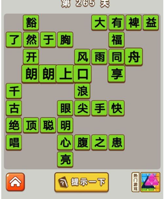 最近很多小伙伴都在问微信成语中状元第265关怎么过,本次给大家带来的是微信成语中状元第265关答案!微信成语中状元第265关答案大有裨益:裨益:益处、好处。形容益处很大。有福同享:指共同分享幸福。风雨同舟:在狂风暴雨中同乘一条船,一起与风雨搏斗。比喻共同经历患