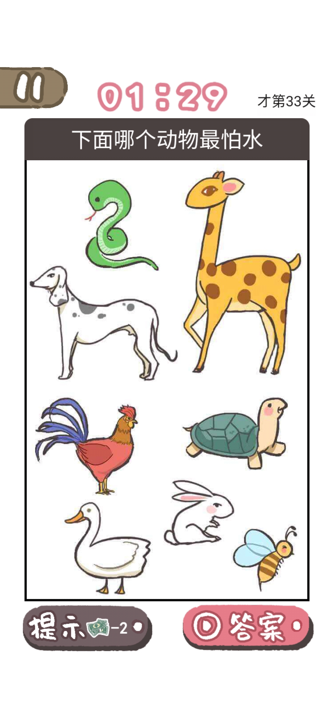 我太难了老铁是一款网络用语改编的大脑洞手游,在游戏中玩家会遇到许多的谜题,这些谜题的答案跟生活紧密相连,不仅要脑洞够大,思路清晰,还要知道需要梗,也能够考验玩家的细心程度,超多有趣的游戏关卡等你来挑战,带你感受游戏的畅快体验,那么我太难了老铁第33关怎么过?快和小编一起来看看这篇下面哪个动物最怕水快速通关攻略一览,相信看完大家对我太难了老铁会有新的认识。我太难了老铁第33关通关攻略问题下面哪个动物
