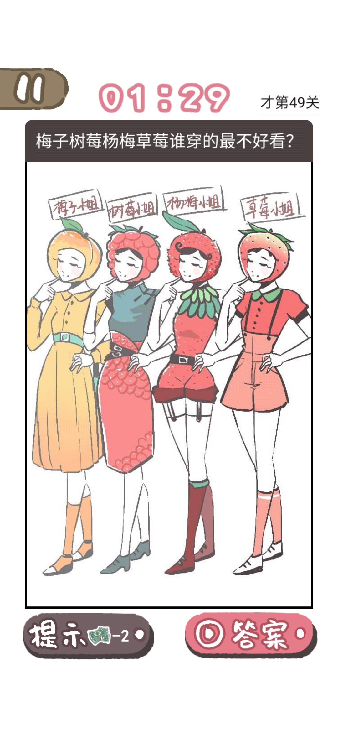 我太难了老铁是一款网络用语改编的大脑洞手游,在游戏中玩家会遇到许多的谜题,这些谜题的答案跟生活紧密相连,不仅要脑洞够大,思路清晰,还要知道需要梗,也能够考验玩家的细心程度,超多有趣的游戏关卡等你来挑战,带你感受游戏的畅快体验,那么我太难了老铁第49关怎么过?快和小编一起来看看这篇梅子树莓杨梅草莓谁穿的最不好看快速通关攻略一览,相信能帮助大家了解。我太难了老铁第49关通关攻略问题梅子树莓杨梅草莓谁穿