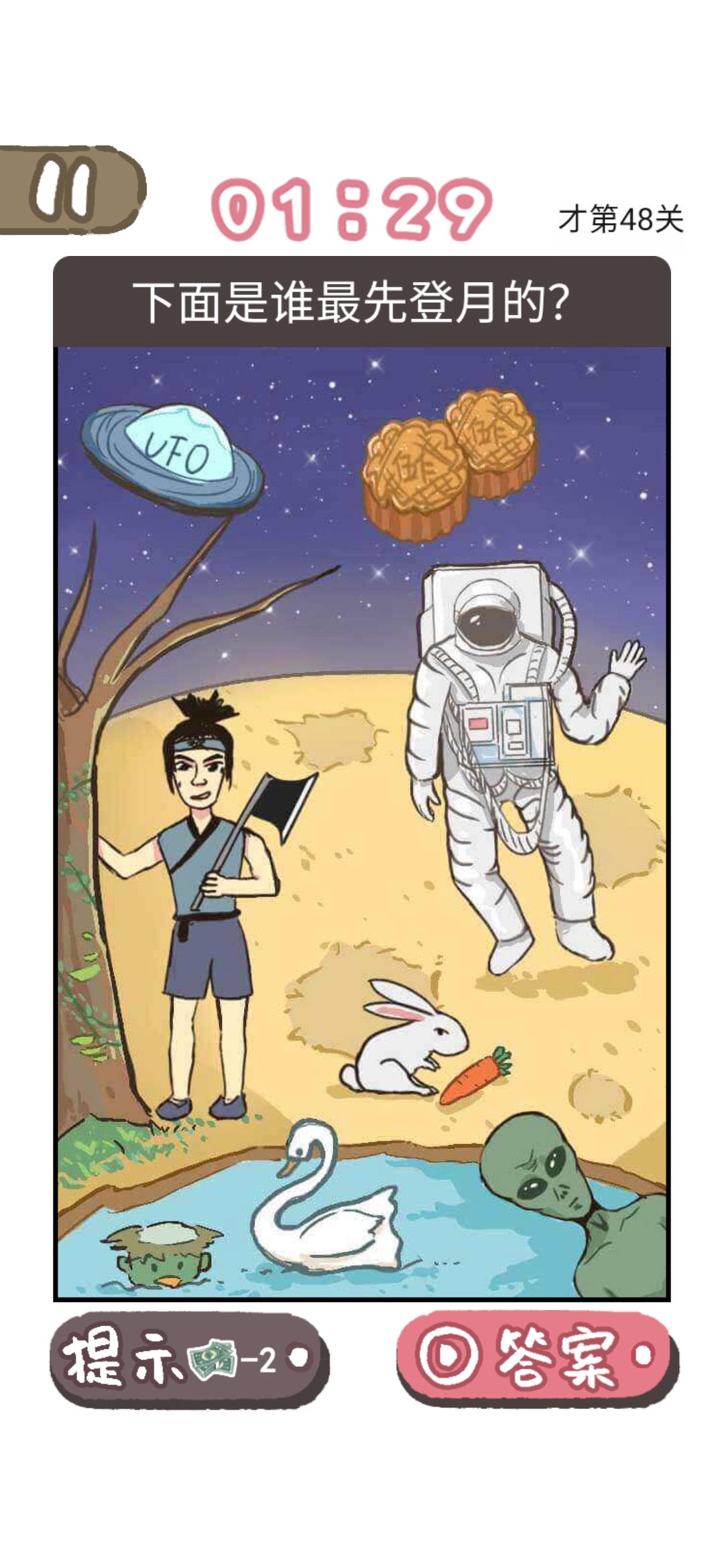 我太难了老铁是一款网络用语改编的大脑洞手游,在游戏中玩家会遇到许多的谜题,这些谜题的答案跟生活紧密相连,不仅要脑洞够大,思路清晰,还要知道需要梗,也能够考验玩家的细心程度,超多有趣的游戏关卡等你来挑战,带你感受游戏的畅快体验,那么我太难了老铁第48关怎么过?快来看看这篇下面是谁最先登月的快速通关攻略一览,相信大家一定会有新的认识。我太难了老铁第48关通关攻略问题下面是谁最先登月的?答案点击天鹅即可
