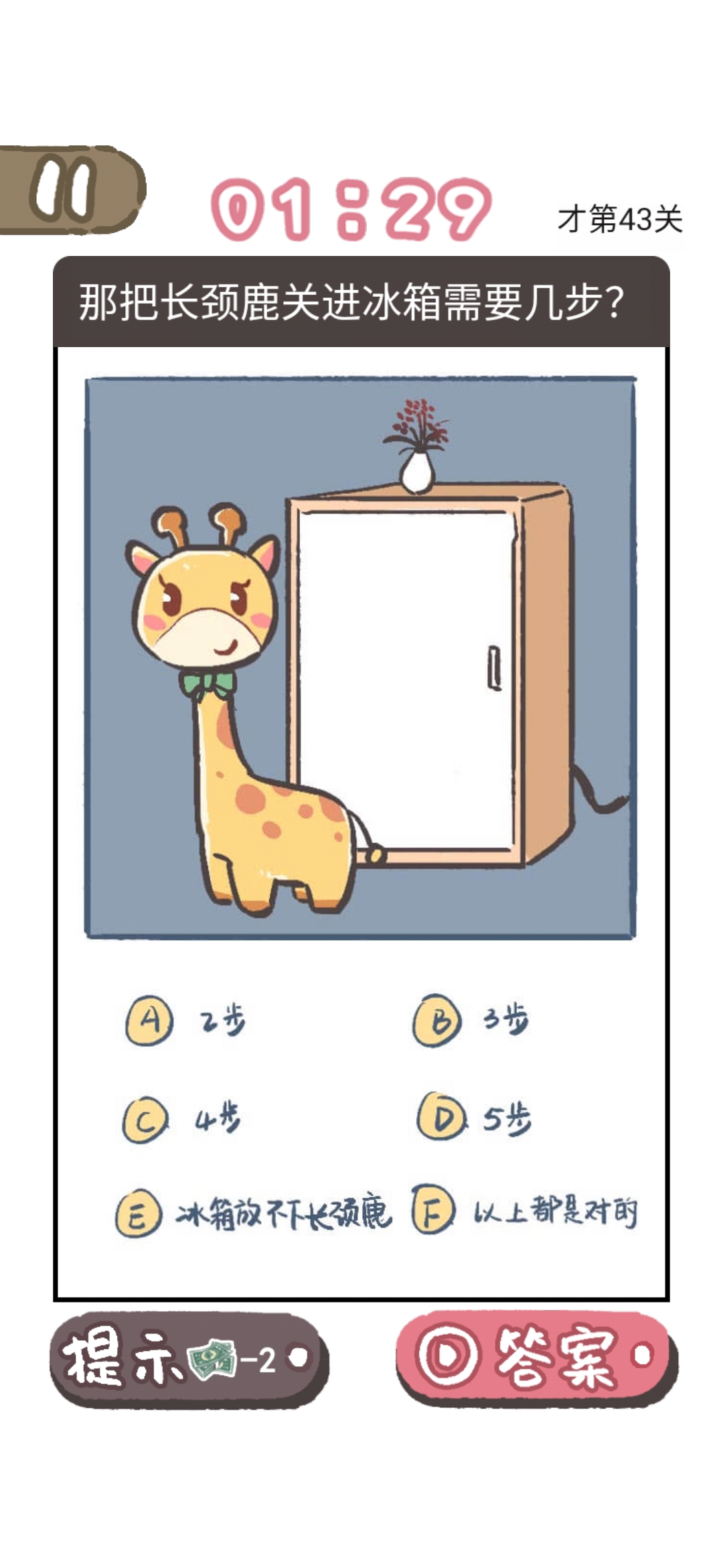 我太难了老铁是一款网络用语改编的大脑洞手游,在游戏中玩家会遇到许多的谜题,这些谜题的答案跟生活紧密相连,不仅要脑洞够大,思路清晰,还要知道需要梗,也能够考验玩家的细心程度,超多有趣的游戏关卡等你来挑战,带你感受游戏的畅快体验,那么我太难了老铁第43关怎么过?快来看看这篇把长颈鹿关进冰箱需要几步快速通关攻略一览,相信大家一定会有新的认识。我太难了老铁第43关通关攻略问题把长颈鹿关进冰箱需要几步?答案