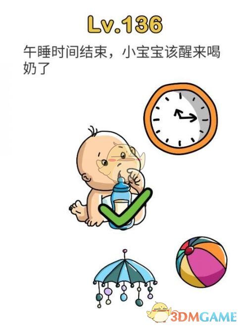 脑洞大师是一款休闲火爆的脑洞关卡游戏,游戏中有许多奇怪的题目等你来挑战,这可不是正经的题目,需要你打开脑洞,找到答案,那么午睡时间结束,小宝宝该醒来喝奶了,脑洞大师第136关怎么过?快来看看这篇brain out午睡时间结束,小宝宝该醒来喝奶了通关答案一览,相信大家一定会有新的认识。题目:午睡时间结束,小宝宝该醒来喝奶了答案:这一关首先转动分针两圈,然后宝宝就醒过来了,醒了就可以把奶瓶给他过关了!