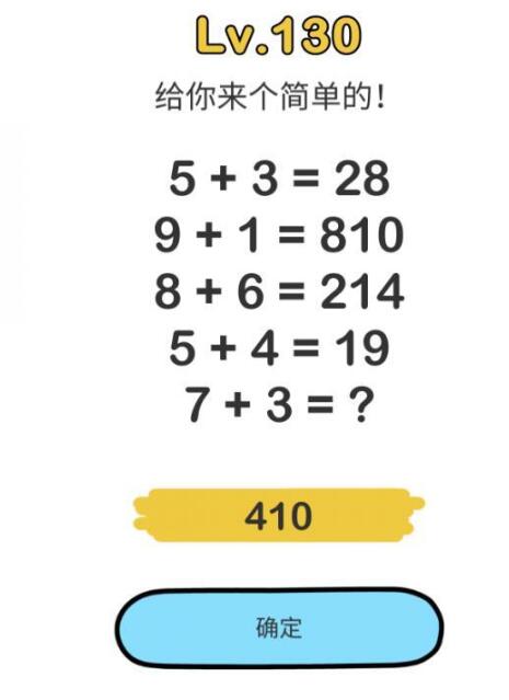 脑洞大师是一款休闲火爆的脑洞关卡游戏,游戏中有许多奇怪的题目等你来挑战,这可不是正经的题目,需要你打开脑洞,找到答案,那么给你来个简单的脑洞大师第130关怎么过?快和小编一起来看看这篇brain out给你来个简单的通关答案一览,相信对大家有所帮助。题目:给你来个简单的正确答案:410观察前边的等式,比如5+3=28,这个是5+3正确是等于8 ,放在了个位上,5-3=2放在了十位上,其他的等式也是