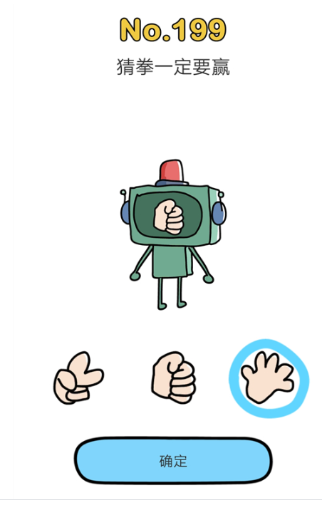 脑洞大师是一款休闲火爆的脑洞关卡游戏,游戏中有许多奇怪的题目等你来挑战,这可不是正经的题目,需要你打开脑洞,找到答案,那么猜拳一定要赢,脑洞大师第199关怎么过?这里小编就给大家带来brain out猜拳一定要赢通关答案一览,希望能作为玩家的参考。题目:猜拳一定要赢正确答案:这一关大家在出拳时先滑动机器人看他出的什么,这样等自己出的时候选择可以赢的就可以了脑洞大师算得上是一款适合儿童的游戏,毕竟收