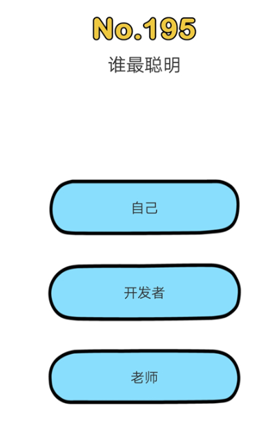脑洞大师是一款休闲火爆的脑洞关卡游戏,游戏中有许多奇怪的题目等你来挑战,这可不是正经的题目,需要你打开脑洞,找到答案,那么谁最聪明,脑洞大师第195关怎么过?快和小编一起来看看这篇brain out谁最聪明通关答案一览,相信对大家有所帮助。题目:谁最聪明正确答案:开发者这一关简单,不知道就挨个点击吧。脑洞大师算得上是一款适合儿童的游戏,毕竟收到条条框框拘束的成年人,很容易被各种墨守成规所困扰,而无