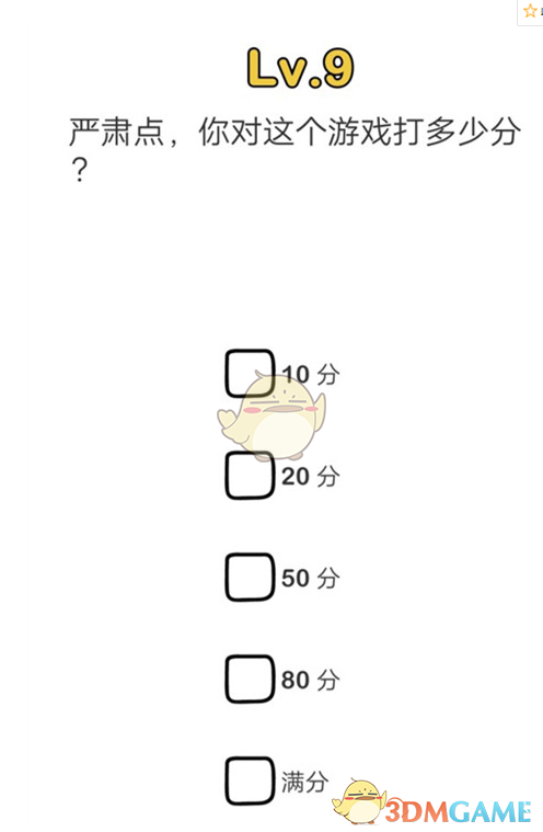 脑洞大师是一款休闲火爆的脑洞关卡游戏,脑洞大师第9关怎么过?想必很多的小伙伴们都不是很清楚,那么接下来,就跟随游戏爱好者小编一起来看一下BrainOut第9关快速通关答案一览吧!感兴趣的小伙伴一定不要错过哦!题目:严肃点,你对这个游戏打多少分正确答案:满分想过