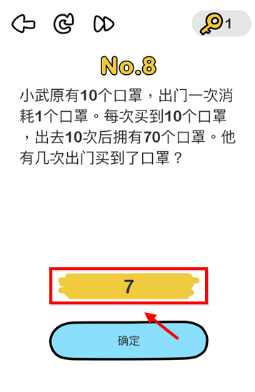 脑洞大师是一款休闲火爆的脑洞关卡游戏,游戏中有许多奇怪的题目等你来挑战,这可不是正经的题目,需要你打开脑洞,找到答案,那么,脑洞大师消灭病毒第8关怎么过?快来看看这篇他有几次出门买到了口罩通关答案一览,相信大家一定会有新的认识。脑洞大师消灭病毒第8关通关攻略题目:小武原有10个口罩,出门一次消耗1个口罩。每次买到10个口罩,出去10次后拥有70个口罩。他有几次出门买到了口罩?正确答案:7解析:第一