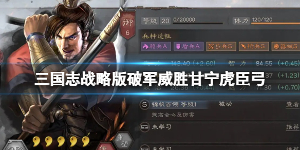 三国志战略版中甘宁虎臣弓这个阵容的强度还是非常高的,可以算是游戏中的T0阵容,但不少玩家还不太清楚这个阵容应该怎么玩。下面就让小编为你详细讲解一下该阵容的玩法攻略,希望能够对你有所帮助!三国志战略版破军威胜甘宁虎臣弓虎臣弓:甘宁:破军威胜+横扫千军(全武+10速)兵书推荐:以治击乱+鬼谋+神机太史慈:折冲御侮+当锋摧决(全武+30速)兵书推荐:以治+将威+神机周泰:盛气凌敌+锦帆军(全统)兵书推荐
