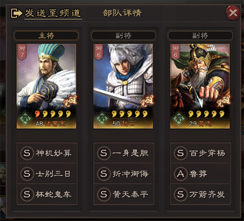 三国志战略版一个有趣的战略游戏,游戏中蜀弓队是一个强力阵容,你知道这个阵容怎样搭配技能吗?下面就让游戏爱好者小编为大家介绍一下三国志战略部蜀弓队阵容搭配及玩法吧~搭配攻略简易讲解:1、赵云先手控制,诸葛、黄忠输出2、诸葛带士别三日目标就是要打5回合左右,黄忠带鲁莽增续航3、缺点:黄忠输出看脸补充另一套平民一点的A级战法诸葛坐守孤城料事如神赵云破阵催坚落凤/净化/纵兵劫掠黄忠鲁莽避实击虚具体攻略:【