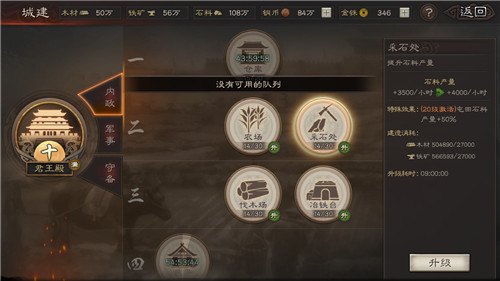 三国志战略版中我们每次升级建筑多需要一定的时长,每一个建筑升级的时候都会占用一个队列,很多玩家在升级建筑的时候系统经常会提醒没有可用队列,这是怎么回事呢?下面小编就为大家介绍一下。队列上限:一般来说没有可以队列代表了我们当前的城建数量达到了最大值,在游戏中我们