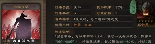 破阵摧坚是中的S级物理群体战法,仅可通过孙坚、文丑传承获得。那么破阵摧坚的伤害怎么样呢?它又适合什么样的搭配呢?接下来让我们一起来看一看吧。一、破阵摧坚介绍与来源破阵摧坚:1回合准备,对敌军2人发动一次兵刃攻击,并使其统率、智力降低,持续2回合。【破阵摧坚】可