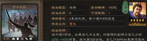 梦中弑臣是中的S级反击类战法,仅可通过曹操传承获得。那么梦中弑臣的反击效果具体是什么样的呢?它又适合什么样的搭配呢?接下来让我们一起来看一看吧。一、梦中弑臣介绍与来源【指挥战法】梦中弑臣:战斗前2回合,如果自己为主将,则使随机副将为自己分担伤害。战斗第3回合起