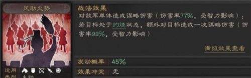 风助火势是中可以通过黄盖、周瑜传承获得的的S级高伤害谋略类单体输出战法。那么这类战法适合什么样的搭配呢?接下来让我们一起来看一看吧。一、风助火势介绍与来源风助火势:对敌军单体造成谋略伤害(受智力影响);若目标处于灼烧状态,额外对目标造成一次谋略伤害(受智力影响