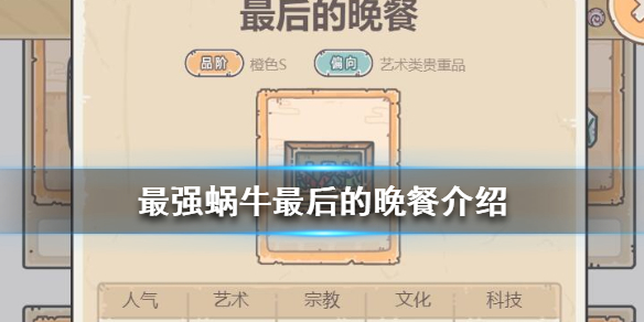 最强蜗牛最后的晚餐有什么属性?最后的晚餐是一个世界名画,那么在最强蜗牛中我们要如何获得它呢,下面小编就为大家带来相关攻略,希望能帮助到你。最强蜗牛最后的晚餐介绍一、光环技能蘑菇园,蘑菇产量+20%蘑菇园,最大容量+20%每提升5级蘑菇园等级,蜗牛防御+40当前共提升1/50级蘑菇园等级蘑菇园,蘑菇产量+20%(觉醒)二、镶嵌技能置于蘑菇园,赋予效果:贵重品自身艺术+15置于蝌蚪池,赋予效果:黑蝌蚪