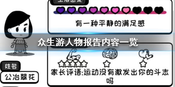 众生游人物报告有什么值得关注的点?作为一款生存模拟类手游,众生游人物报告上面包含了玩家操控角色的绝大部分基础属性值,是非常重要的培养参考,但很多玩家可能并不完全了解其中的内容,接下来就由小编为大家介绍一下吧!众生游人物报告内容图文分享1、人物报告①人物报告包含了人物基本信息,如姓名,年龄,性格,出身,生活感受,基础评价和擅长爱好,一共7个信息。②关于姓名:一是孩子会跟父亲或者母亲姓,二是名会根据出