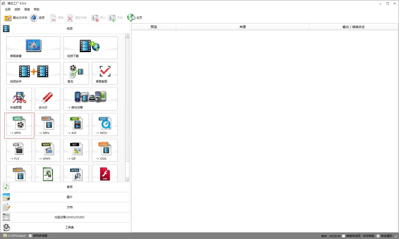格式工厂强大功能,支持对各种文件需要的文件格式进行转换,除了文件格式转换外,格式工厂还支持对不少文件进行编辑修改,小编下面就为大家演示使用格式工厂制作一段简短的视频,方法简单,看小编的截图流程操作就可以了。一、首先打开格式工厂,点选“MP4”,不要用“所有转到