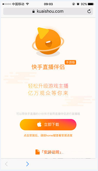 苹果版的快手直播伴侣怎么用呢?就让我们一起来看看吧。 1、下载快手直播伴侣 点击查看:苹果版快手直播伴侣下载教程 2、打开下载页面后,点击下载按钮进行下载安装。 3、首次安装后,会看到以下弹窗,此时点击取消。 4、在设置中进行应用