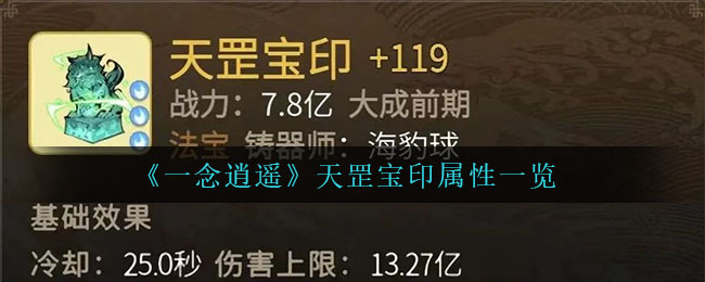 在一念逍遥中天罡宝印是一件非常强力的装备,那么其中这个天罡宝印怎么样,对此,不了解的小伙伴,那就快来看看小编给大家准备的相关游戏内容吧!《一念逍遥》天罡宝印属性一览基础效果冷却: 25.0秒 伤害上限: 13.27亿对敌方1个目标造成428.00%物攻+ 2949.36万点物理伤害上述关于一念逍遥的相关内容就到这里了,希望游戏爱好者小编用心收集发布的游戏或软件能对大家有所帮助。