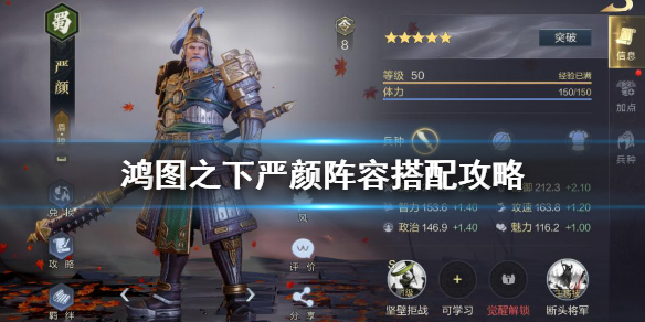 鸿图之下严颜怎么搭配阵容,在鸿图之下中严颜作为蜀国的武将有着相当不错的属性,那么这样一位老将的存在应该怎么搭配合适的阵容呢?很多小伙伴对这方面的内容还不是很了解,为此,小编特地为大家整理了这些内容,一起往下看看吧!鸿图之下严颜阵容搭配攻略主将严颜+关羽+小乔组建以严颜为核心的队伍时,可以尝试把严颜放在主将上。这样可以最大化地将严颜对连击队的克制发挥出来。断头将军降低连击伤害的特性,使得严颜在面对连