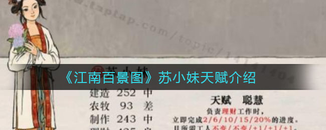 江南百景图游戏中苏小妹作为新上线的人物,那么她的具体天赋是什么呢?相信还有很多小伙伴不清楚,对此游戏爱好者小编特地为大家准备了相关的详细内容,让我们一起来看看吧!《江南百景图》苏小妹天赋介绍琴棋好闲日,诗酒正年华 —— 苏小妹天赋【聪慧】负责理财工作时,立即完成2%/6%/10%/15%/20%的进度,且所需工人+0/+0/+1/+1/+1。(人物品阶越高,立即完成的进度越多。)秦观刚踏进苏府,就