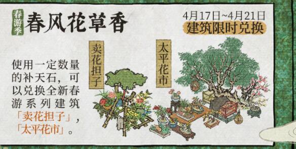 江南百景图全新春游系列建筑太平花市马上就要上线了,那么我们具体应该怎么获得这个建筑呢?相信还有很多小伙伴不清楚,对此游戏爱好者小编特地为大家准备了相关的详细内容,让我们一起来看看吧!江南百景图太平花市获得方法介绍一、获得方法4月17日~4月21日期间,参加春游季春风花草香活动,使用一定数量的补天石,可以兑换全新春游系列建筑太平花市。二、建筑规格2*3繁荣值+45三、建筑故事虎大爷每天早上从观星台下