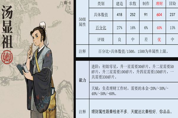 江南百景图汤显祖怎么样?汤显祖值不值得玩家培养,有哪些途径可以获得汤显祖,为此,小编为大家特地准备这篇更加详细的攻略,快和小编一起来看看吧!汤显祖怎么用汤显祖,优级理财,再加上天赋,可常年挂机刷钱。珍宝推荐理财类珍宝,如澄泥砚。搭配澄泥砚,理财属性862,理财加成57%,农牧加成29%。( 属性因进阶原因略有上浮,下同)那么关于江南百景图汤显祖人物属性的内容就到这里了,更多精彩内容请继续关注游戏爱