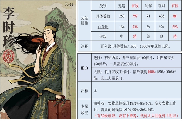 江南百景图李时珍怎么样?李时珍值不值得玩家培养,有哪些途径可以获得李时珍,为此,小编为大家特地准备这篇更加详细的攻略,快和小编一起来看看吧!李时珍怎么用李时珍,真正的农牧第一-人!珍宝推荐农牧类珍宝。如湖神石/哮天犬/鸡缸杯/澄泥砚(推荐哮天犬)。搭配湖神石,农牧属性1171,农牧加成78%,冒险体力505。搭配哮天犬,农牧属性1132,农牧加成75%,冒险体力509。搭配鸡缸杯,农牧属性1062