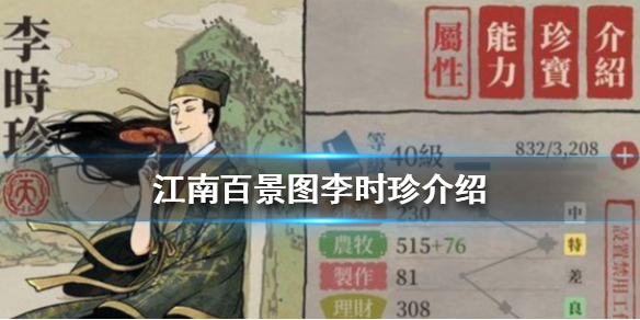 江南百景图李时珍怎么样?李时珍是江南百景图中的一位特殊居民,那么他的天赋是什么,好不好用呢,下面小编就为大家带来相关攻略,希望能帮助到你。江南百景图李时珍介绍天赋-百草,在做【农牧】工作时,额外获得该产品100%,且工人需求-1。有专属天系法宝:湖神石(目前连动性最强的专武法宝)。偏【农牧】、【冒险】取向,可以的话最好让他做跟【农牧】有关的事情,毕竟才会触发天赋,偶尔也可以【探险】(有探险探索大活