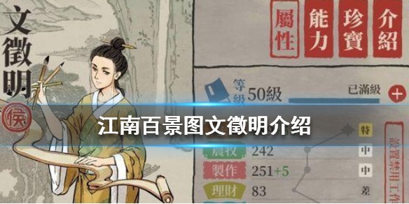 江南百景图文徵明技能是什么?文徵明是明代大书法家,大家对他也是比较熟悉了吧,那么江南百景图中文徵明的技能是什么呢,下面就跟小编来一起看看吧。江南百景图文徵明介绍天赋-妙笔:在建造新建筑(这是指盖新的房子或是新建筑,升等不算) ,立即完成30%进度。在解牡丹亭剧情时候,要注意确保自己有开到开完每剧情地区的宝箱,这样才会有足够碎片可以进阶,进阶后天赋会再多3%,总计33%。偏建造、冒险取向。也是伪侯系