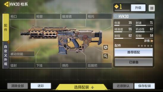 使命召唤手游Hvk-30怎么样,在使命召唤手游中枪械强度可以说是非常重要的一个选择,那么其中Hvk-30的强度到底怎么样呢?对此,不了解的小伙伴,那就快来看看小编给大家准备的相关游戏内容吧!使命召唤手游突击步枪Hvk-30强度介绍一、基本信息1、伤害:武器单发命中伤害面板数据:352、射程:子弹打击距离和伤害衰减程度面板数据:62实际评测:3、射速:每秒射击的子弹数量面板数据:71实际评测:无配件