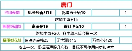 我的侠客唐门秘奥义应该怎么组合,唐门作为游戏中非常帅气的一个门派,是很多玩家喜欢的门派之一,那么唐门在游戏中又有着怎么样的秘奥义可以使用呢?相信还有很多小伙伴不清楚,对此游戏爱好者小编特地为大家准备了相关的详细内容,让我们一起来看看吧!唐门秘奥义怎么组合表格中对应位置表示:名称,,组成方式,,回合数游戏详述两次测试都有玩,每次都是通关一周目后,第二周目没通关测试时间就到了,主要就是第一次玩的时候有