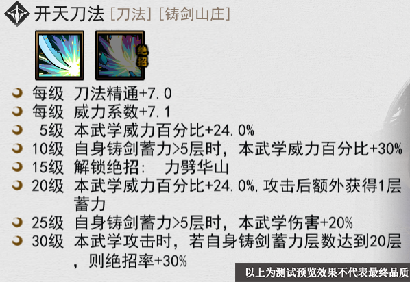 开天刀法作为铸剑山庄中特有的暗金武学,其自身特点就是蓄力层数越多,伤害也就会越高,那么具体强度到底怎么样呢?下面,就和游戏爱好者小编一起来看看关于这方面的详细内容攻略吧!我的侠客开天刀法怎么样一、武学介绍开天刀法是铸剑山庄的暗金武学。开天刀法:自身蓄力层数越多,攻击威力越大。二、武学动态展示()三、铸剑山庄加入方法铸剑山庄位于泰山。玩家在《魔君乱江湖》、《自由模式》剧本中可以拜入铸剑山庄,无特殊解