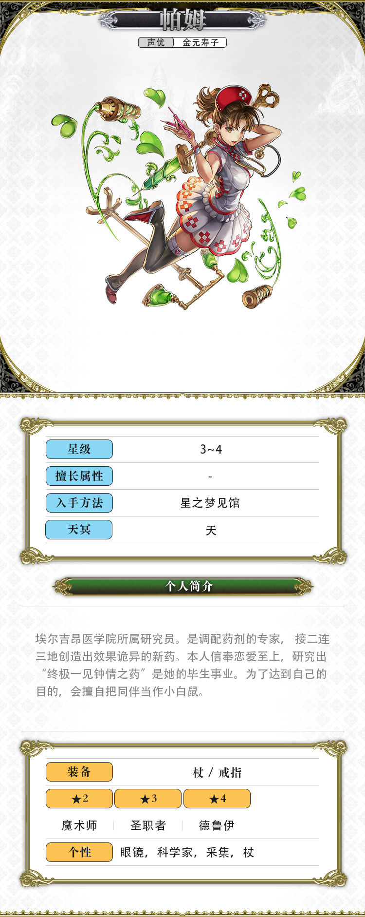 另一个伊甸超越时空的猫帕姆的人物强度怎么样,帕姆作为一名调剂药剂的专家,能够很好的为我们带来强力的回复效果,并且进行属性上的增益,那么这样的一名角色强度到底怎么样呢?相信还有很多小伙伴不清楚,对此游戏爱好者小编特地为大家准备了相关的详细内容,让我们一起来看看吧!帕姆人物属性一览换阵咏唱:LV1 - 【来试试吧!】给予敌方全体全属性耐性下降15%(1回合)LV2 - 【要不要来点超棒的药!】给予敌方