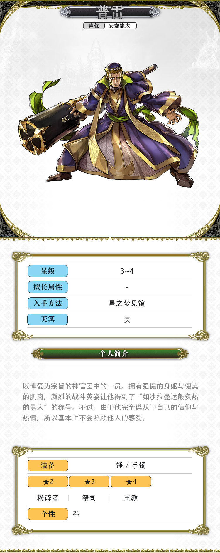 另一个伊甸超越时空的猫普雷的属性怎么样,普雷的外表虽然看起来很强悍,但是他却是一名实打实的辅助角色,那么这样一个外表硬汉无比的“奶妈”到底有着怎么样的实力呢?可能还有很多小伙伴不清楚这个问题,但是小编给大家准备了相关的详细内容来帮助大家更好的了解,下面让我们一起来看看吧。普雷人物属性一览换阵咏唱:LV1 - 【为彷徨的灵魂祈祷!】赋予我方全体全属性耐性上升15%(1回合)LV2 - 【我的信仰丝毫