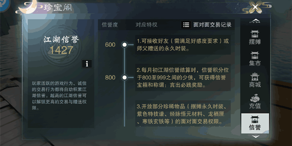 一梦江湖江湖信誉有什么用?江湖信誉是游戏中非常重要的一个数值,玩家信誉的高低直接影响到玩家在游戏里的表现,那么信誉积分应该如何提升呢?让小编来告诉你。江湖信誉是本作之中衡量账号的诚信和活跃程度的一项非常重要的指标,信誉高的人能够在社交和交易之中拥有更多的权限而