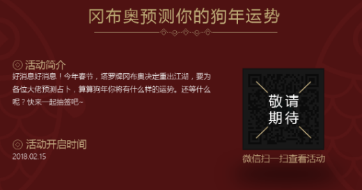 不思议迷宫近日推出了新年幸运签的活动,里面可以预测狗年的运势和美好的祝福。那么我们应该在哪里才能玩呢?下面小编就来为大家介绍一下参加方法。 活动时间: 2018.02.15 活动攻略: 微信扫一扫查看活动,抽取新年幸运签~ 本次春节迷宫