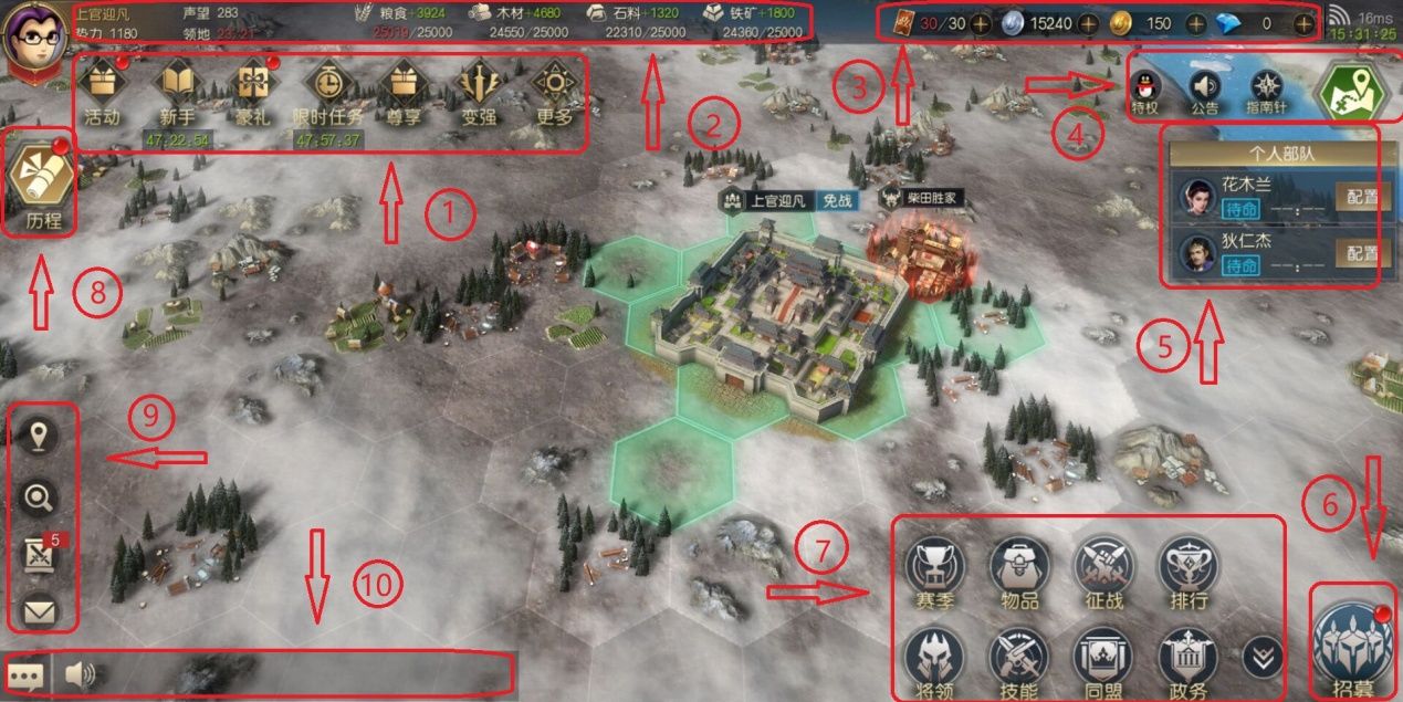 很多新手玩家在刚进入游戏的时候,对于系统界面的各种功能都不是非常了解,关于这个小编已经帮大家准备好了相关内容,希望可以帮助到大家,快来和小编一起来看看吧。征服与霸业主界面功能介绍罗列当前配置的所有部队,在该界面区域中可点击查看部队详情,也可对部队进行相关操作,包括:配置,撤军等操作。在该界面,可消耗金币和银币选择对应的卡包进行招募,招募获得的将领分为九州,东瀛、西洋和古典四个阵营。招募到的将领可以