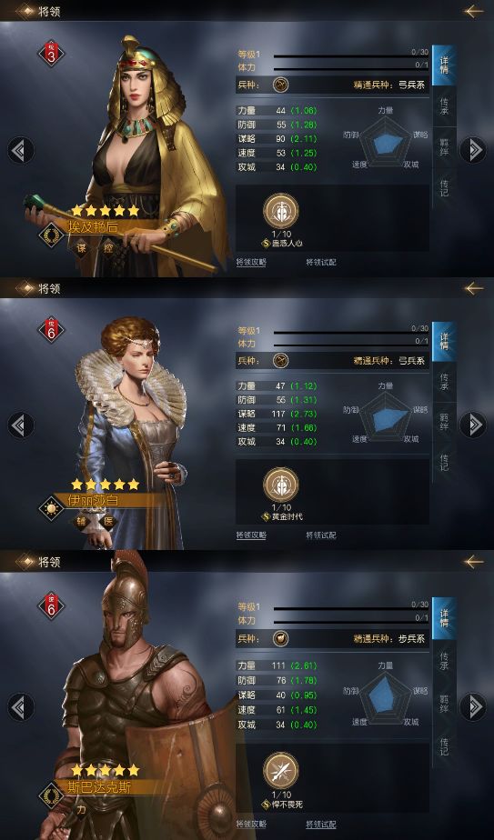 在游戏中我们可以通过不同武将的特性来搭配出各种玩法,其中磨血流作为一套非常不错的玩法,能够有着高伤害以及高续航的完美搭配,那么具体应该怎么组合呢?对此,不了解的小伙伴,那就快来看看小编给大家准备的相关游戏内容吧!征服与霸业磨血流阵容玩法一览【搭配思路】这套阵容是埃及艳后为主将,伊丽莎白和斯巴达克斯为副将组成的。主要依靠埃及艳后谋略技能输出,斯巴达克斯物理输出,再加上伊丽莎白的保护及兵力恢复。这三个