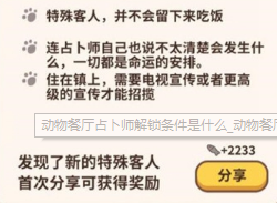 动物餐厅占卜师解锁方法介绍是游戏爱好者今天要给大家带来的资讯,动物餐厅游戏中占卜师怎么解锁?很多玩家都不是很清楚,下面游戏爱好者网就为大家带来了动物餐厅占卜师解锁方法介绍,帮助大家解锁。动物餐厅占卜师解锁方法介绍 特殊客人,并不会留下来吃饭。连占卜师自己也说不