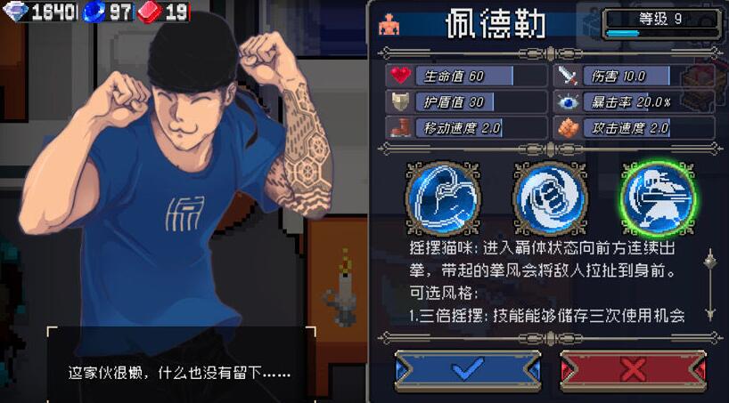战魂铭人是一款十分热血刺激的动作冒险类游戏,游戏采用复古的像素风作为游戏背景,丰富的关卡供玩家体验,其中的商店老板是我们必须要通过的一个关卡,无论是一技能还是三技能都可以十分刺激的通过这一关,那么我们可以使用二技能来过关吗,今天小编为大家带来战魂铭人商店老板二技能通关攻略,希望大家喜欢。其实二技能对比其他职业来说,强度还是非常高的,主次双技能,基本上就是无敌的,不贪肯定不会死,风格选更大的旋风。这