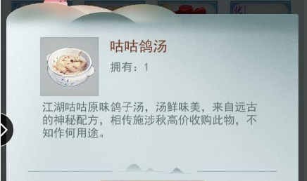 在江湖悠悠手游中咕咕鸽子汤菜谱怎么样呢?在江湖悠悠手游中咕咕鸽子汤是小伙伴们可以制作的菜系之一,那么不清楚具体配方是什么的话,下面就来看一下吧!江湖悠悠咕咕鸽子汤菜谱制作攻略鸽子汤需要一只鸽子,再加三桶水,做了很多次,都没有成功,希望大家做出来了,告诉我江湖咕咕原味鸽子汤,汤鲜味美,来自远古的神秘配方,相传施涉秋高价收购此物,不知作何用途。以上就是游戏爱好者小编为您带来的全部内容,更多资讯关注游戏